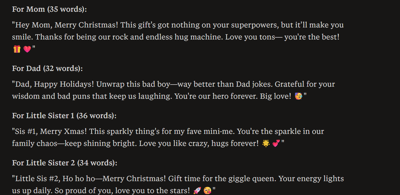 Write Christmas wishes to write on presents for my family and keep the tone friendly. Add some witty remarks with an emotional touch to show my care and love for the family.
